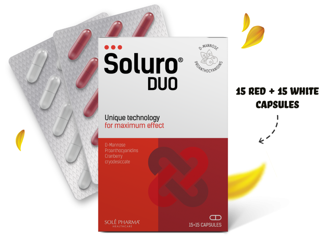 Soluro® DUO is intended for patients with uncomplicated cystitis with mild to moderate symptoms. The capsules contain cranberry proanthocyanidins and D-mannose, which act as a protective shield and prevent cystitis from worsening. Both bioactive substances are effective from the first day of use and are also included in the treatment guidelines of the European Association of Urologists.